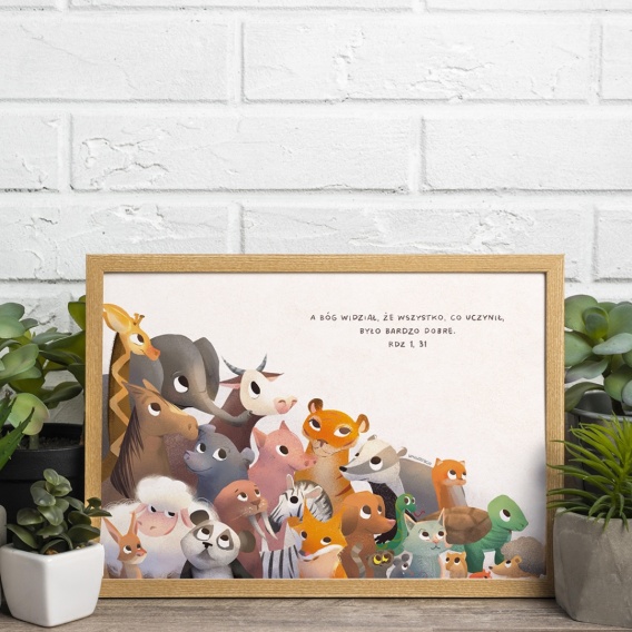 Plakat ma pastelowe kolory i urocze postacie zwierzątek. Patrząc na ten plakat dziecko będzie stale przypominać sobie że jest Bożym Stworzeniem i że zostało stworzone bardzo dobrze.