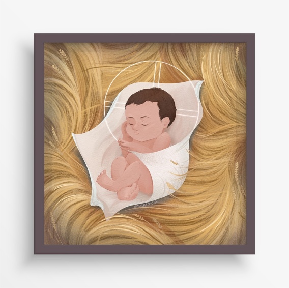 Obraz z urodzym Dzieciątkiem Jezus zaplątanym w pieluszkę tuż po urodzeniu, leżącym na cieplutkim sianku i leniwie przeciągającym się jak to tylko noworodki potrafią. Ta ilustracja uświadamia jak pokornie i cicho Bóg zstąpił na Ziemię, jak przyszedł na Świat zupełnie nagusieńki i maleńki.