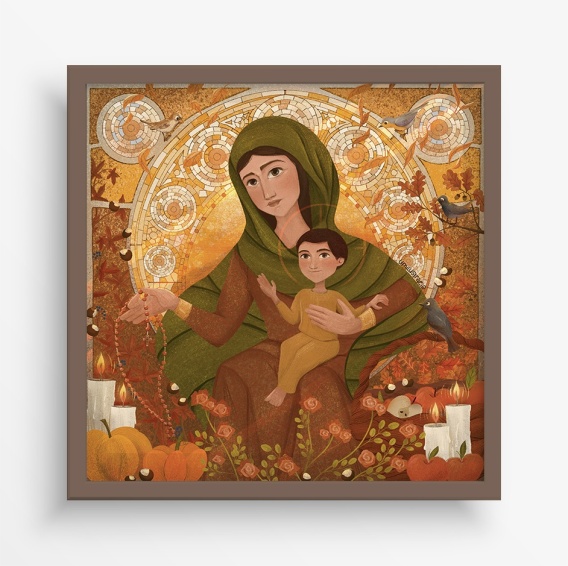 Przytulna ilustracja Matki Boskiej Różańcowej - Ten obraz przypomni o modlitwie na różańcu i idealnie wpasuje się w jesienny nastrój w domu.